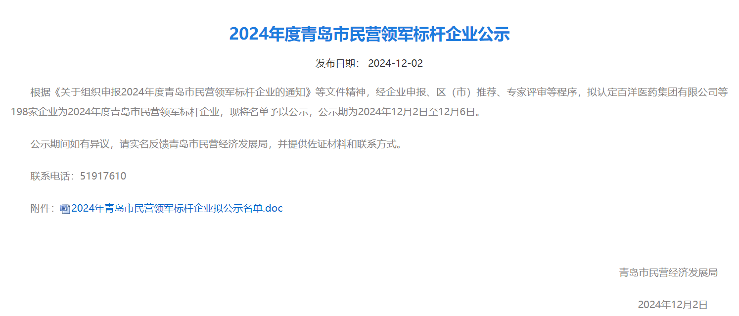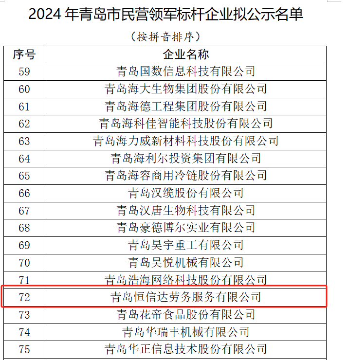 近日,恒信达成功入选青岛市民营领军标杆企业之一。青岛市民营经济发展局公布了“2024年度青岛市民营领军标杆企业”,名单如下: